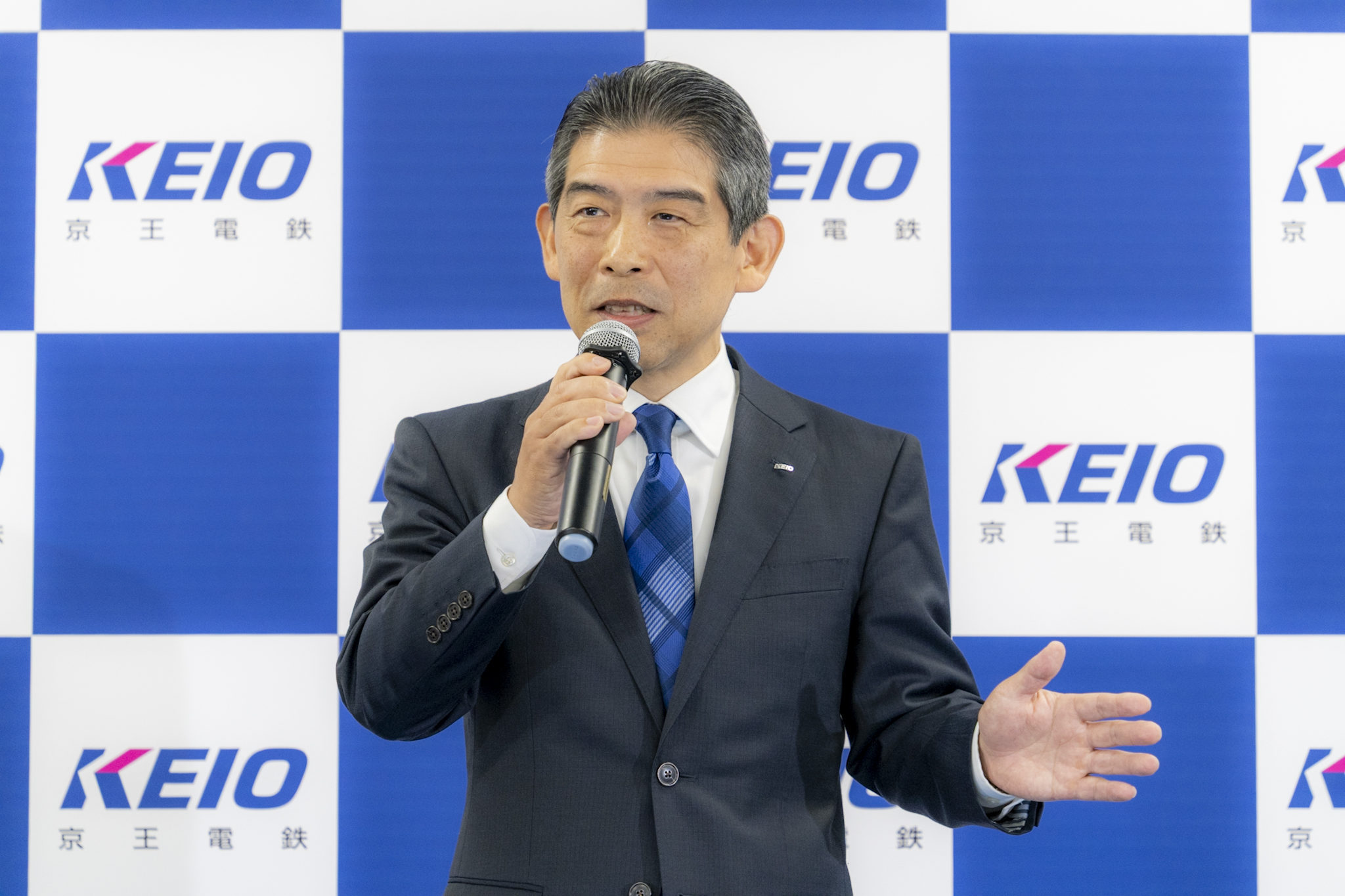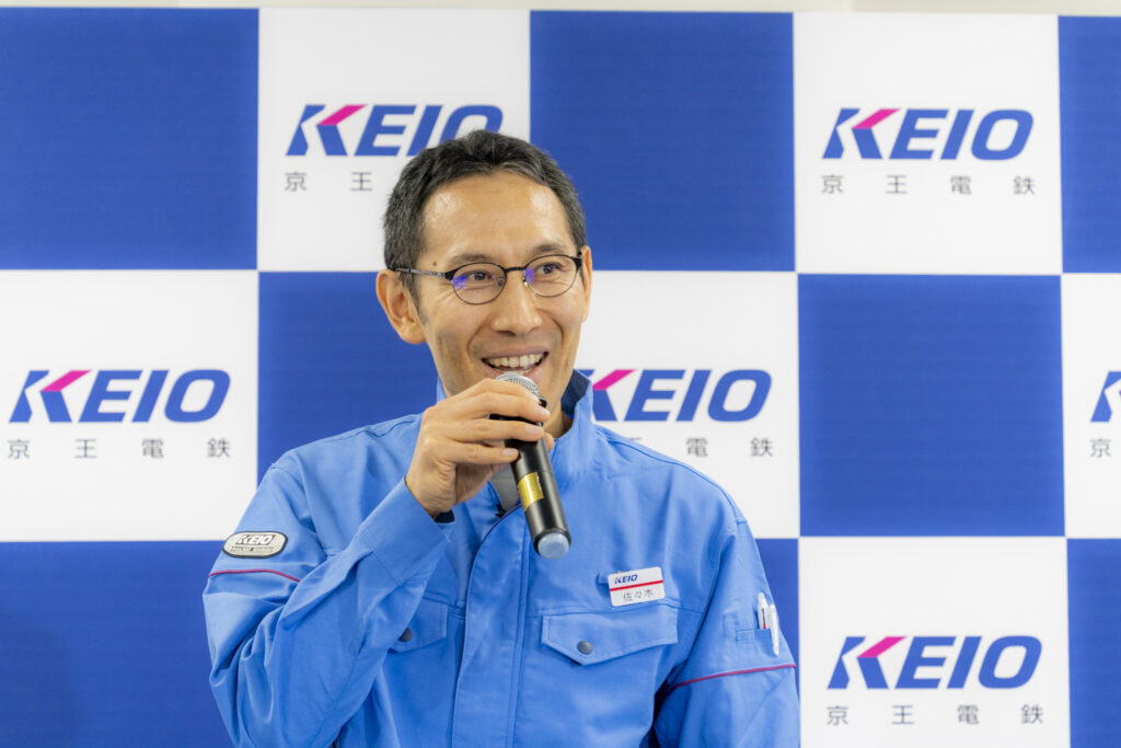 まず始めに、京王電鉄 取締役常務執行役員 鉄道事業本部長 井上 晋一より挨拶をしました。「この車両は、安全、安心、やさしい、ワクワクというキーワードをもとに開発した車両です。まず外観について、丸いフォルムを中心に構成しており、安心とやさしさを表現しています。みなさんに注目していただきたいのは、車両デザインを京王グループの感性AI株式会社が提供する分析ツール『感性AIアナリティクス』を活用して決定した点です。多くのお客さまや社員から、電車に期待されるキーワードを集め、複数の車両デザイン案を言語化し、これをAIでマッチングさせ、お客さまが望むイメージに最も近いデザインに決定いたしました。二番目に車内についてですが、当社としては初めてとなる大型フリースペースを採用しました。ベビーカーや、お子さま連れのお客さまがもっとお出かけしたくなる、ワクワクが詰まっています。また、車いすをご利用の方、スーツケースをお持ちの方にも大変使いやすく、すべてのお客さまにやさしい設計となっています。三番目は、脱炭素、省エネへの取り組みです。当社は早くから省エネの取り組みを始めており、2012年にはすべての車両がVVVFインバータ制御装置を搭載した省エネ車両となりました。そして今回の『2000系』は、第三世代となる新型のVVVFインバータ制御装置を搭載した車両で、未装備のものに比べて約70%も消費電力を抑えた省エネ車両となっています。また、今回は新しい車両設計にあたり、女性社員も開発に携わっています。さまざまな思いを込めた新型車両を、皆さんに末永く可愛がってもらえたらと思います」と語り、集まった報道陣に向かい、深々と一礼をしました。