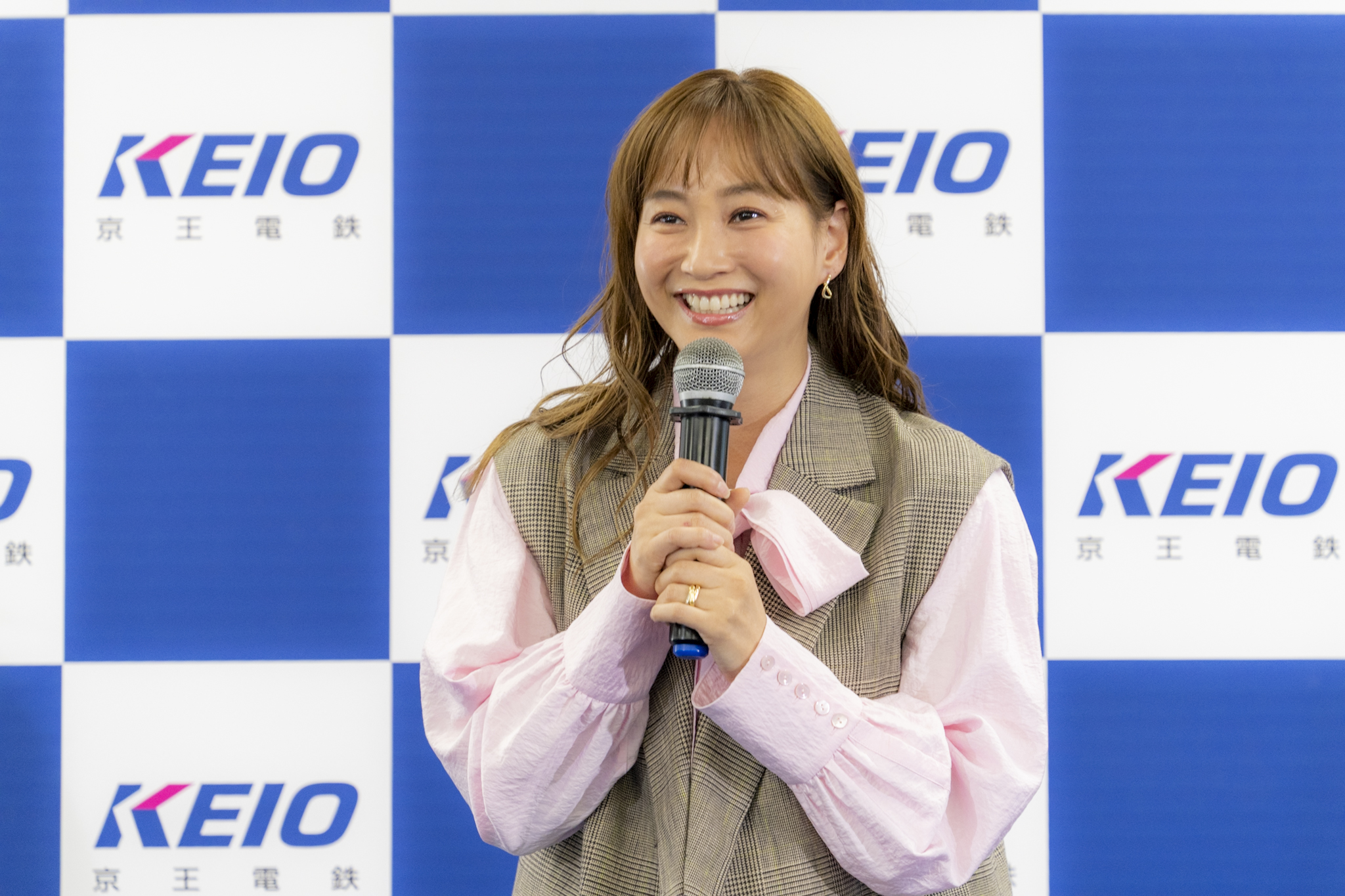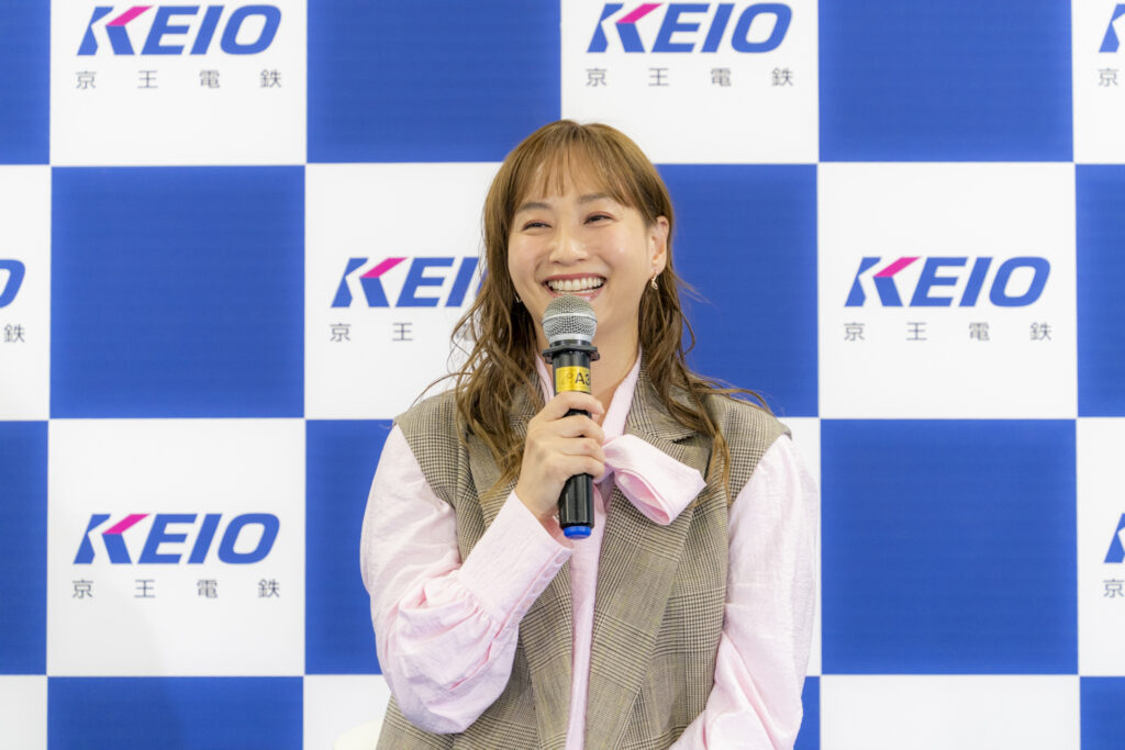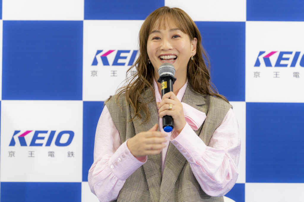 MCによる紹介の後、藤本美貴さんが、京王線車両に用いられているピンクのカラーを取り入れた爽やかな装いで登場。パパ・ママを代表して登壇した藤本さんは色々な場面で子育てに関する赤裸々なコメントも話題を呼んでいますが、現在お子さまは何名いるのか聞かれると「13歳の長男と、10歳の長女と、5歳の次女がいます」と紹介。普段からお子さまと一緒に電車に乗っているのかという質問に対しては「乗っています。子どもが電車通学だったりするので、学校に一緒に行くときもそうですし、お出かけも電車で行くほうが便利なところも多いので、よく子どもたちと利用します」と明かしました。