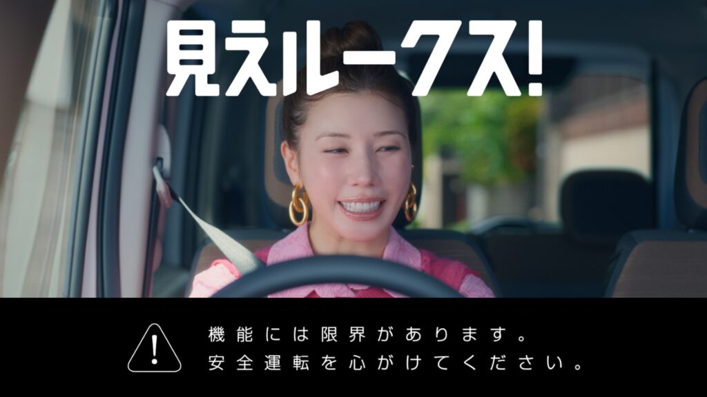 仲里依紗さんにご出演いただいた新CMのキーワードは“見えルークス”。新たに搭載されたインテリジェント アラウンドビューモニターの「フロントワイドビュー」は、見通しが利かない曲がり角で運転席から死角となる角の先を広角映像で確認できる視界サポート機能です。そんな”見える”新機能により、安心して運転を楽しむ仲さんの姿を映し出しています。