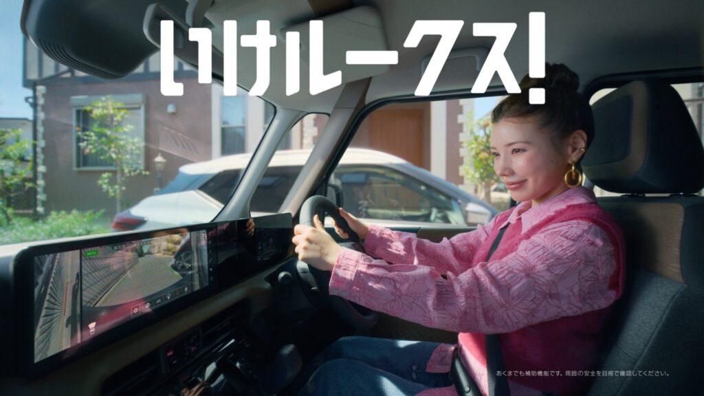 「角の先まで、見えルークス」「すれ違いも、いけルークス」「毎日気分が、あがルークス」/「見えない危険が、見えルークス」「室内ひろびろ、乗れルークス」「ワタシの楽しみ、ひろがルークス」の楽曲に合わせて、仲さんが運転に注意が必要な街中を軽やかに巡ります。交差点への進入時の死角から接近する自転車もフロントワイドビュー機能によりしっかり確認。さらに、細い道でのすれ違いもスムーズで、「よっしゃ!」とほほ笑みます。運転の不安や煩わしさから解放され、毎日の気分があがり満足気な表情を浮かべる仲さん。最後は“見える”機能にちなんだ「見えルークス」ポーズでCMを締めくくります。