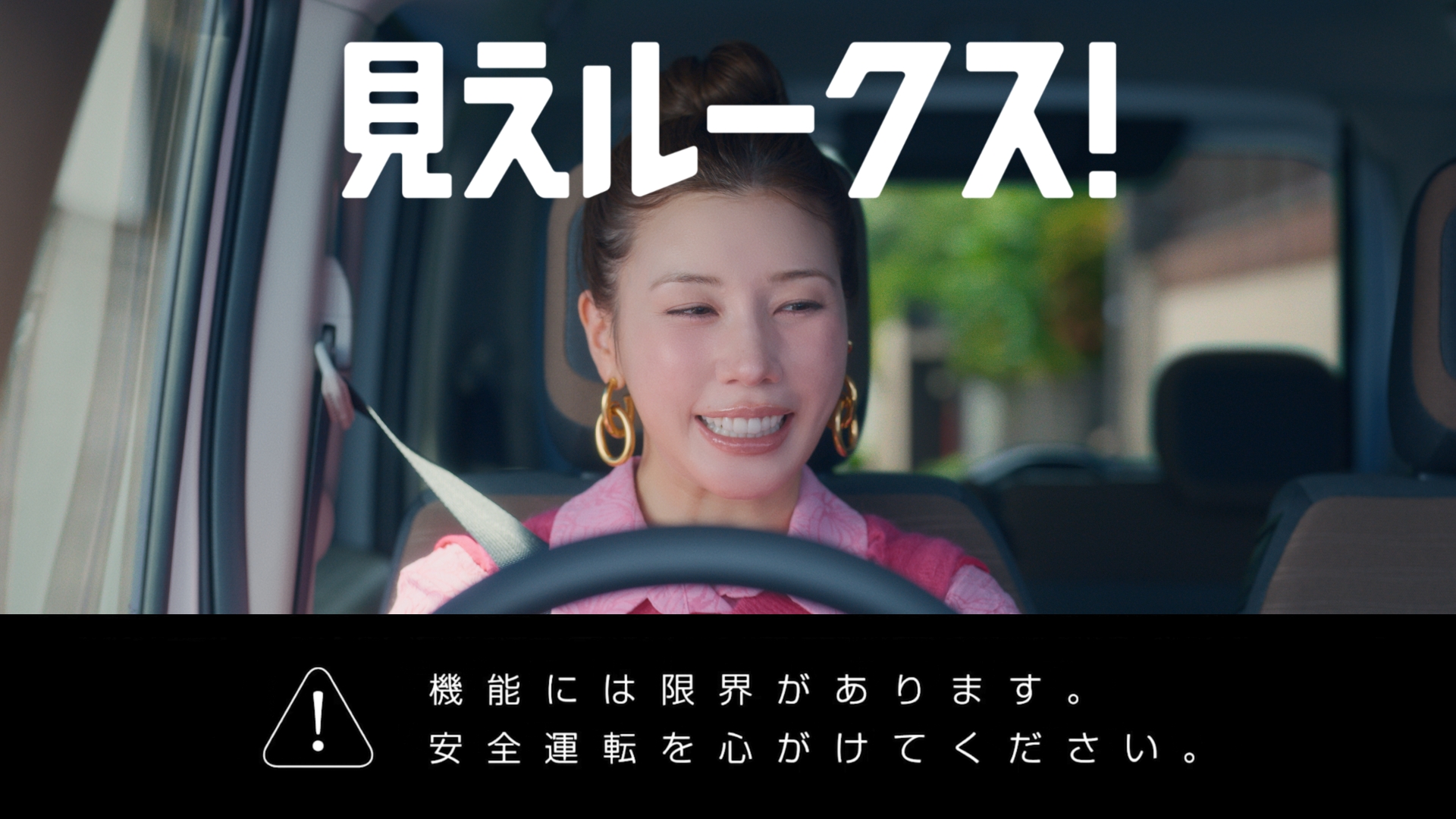 「角の先まで、見えルークス」「すれ違いも、いけルークス」「毎日気分が、あがルークス」/「見えない危険が、見えルークス」「室内ひろびろ、乗れルークス」「ワタシの楽しみ、ひろがルークス」の楽曲に合わせて、仲さんが運転に注意が必要な街中を軽やかに巡ります。交差点への進入時の死角から接近する自転車もフロントワイドビュー機能によりしっかり確認。さらに、細い道でのすれ違いもスムーズで、「よっしゃ!」とほほ笑みます。運転の不安や煩わしさから解放され、毎日の気分があがり満足気な表情を浮かべる仲さん。最後は“見える”機能にちなんだ「見えルークス」ポーズでCMを締めくくります。