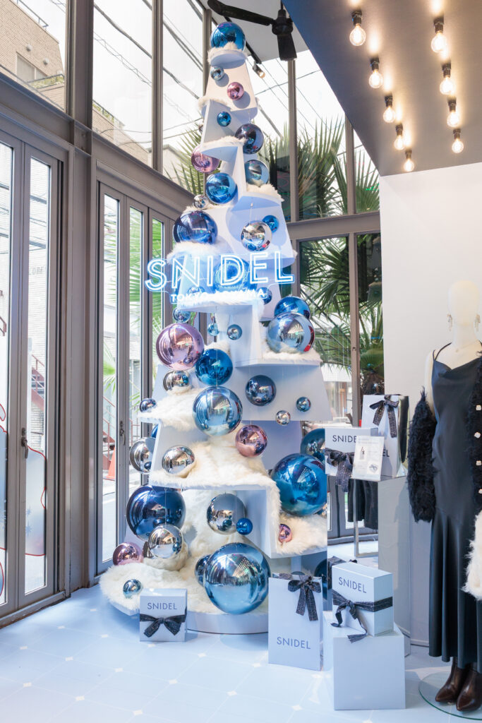 店内に一歩足を踏み入れると、一気に広がるHOLIDAYムード。ライトブルーのネオンが光るSNIDELらしいクリスマスツリーが出迎える店内には、SNIDELの新作アイテムや青山店だけの限定アイテムがずらり。HOLIDAYが待ちきれない!というほどに気分を盛り上げてくれます。