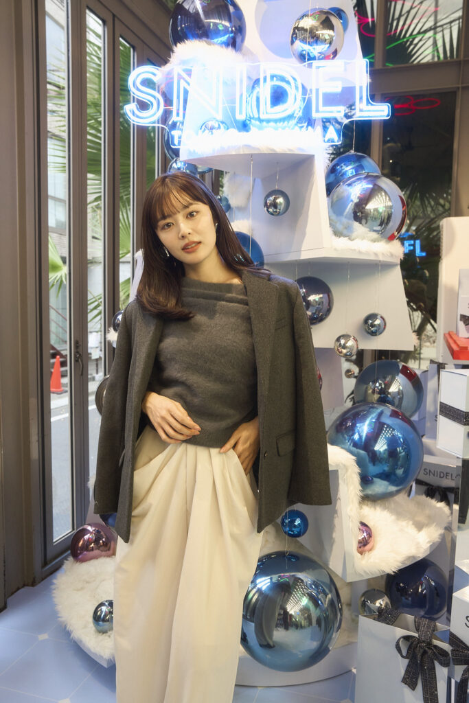 古畑星夏さんは、「入った瞬間からかわいい冬のコーディネートがずらっと並んでいたのと、素材感が楽しめる洋服もたくさんあったので、早くクリスマスになって欲しいなって思いました」と声を弾ませていました。ジャケットが好きだという古畑さん。この日もSNIDELの新作アイテムを取り入れたジャケットコーデで登場。“ちょっと甘めなお姉さん”をテーマにした、華やかなコーデは参考になりそうです。今年のクリスマスの予定は、SNIDEL CAFEのドーナツなど大好きなスイーツを集めてパーティーをしたい」と古畑さん。友人を招いて、2匹の愛犬と一緒にホームパーティーを楽しみたいそうです。