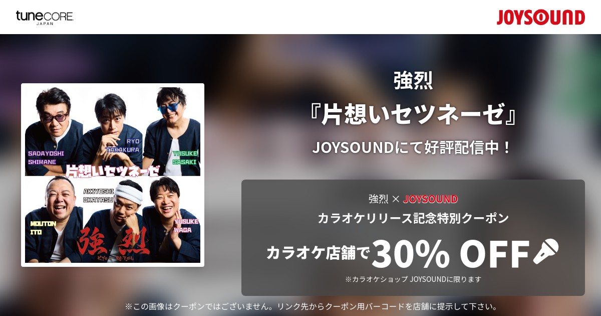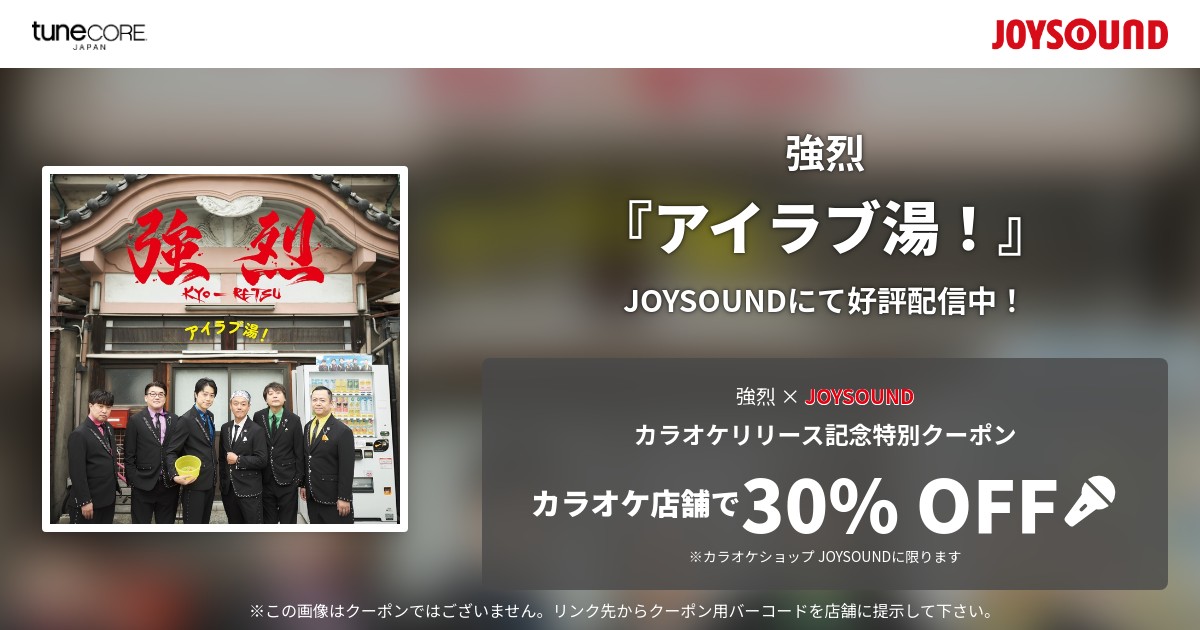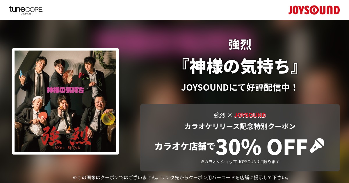 今回のカラオケリリースを記念して、カラオケショップ JOYSOUND限定で使える「強烈」特別クーポンが発行されました。3曲ぶんが発行されています! 期限は2026年4月末まで! 使用条件などはクーポンをご覧ください。