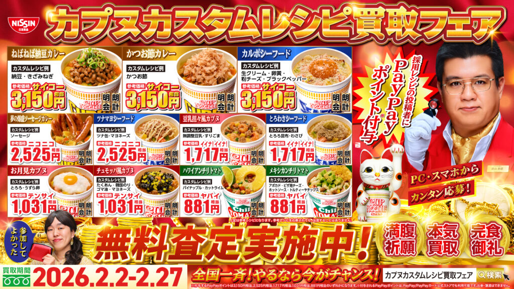 日清食品株式会社 (社長:安藤 徳隆) は、お客さまが考案した「カップヌードル」のカスタムレシピを鑑定・査定・買取する「カプヌカスタムレシピ買取フェア」を2026年2月2日(月)より開催します。