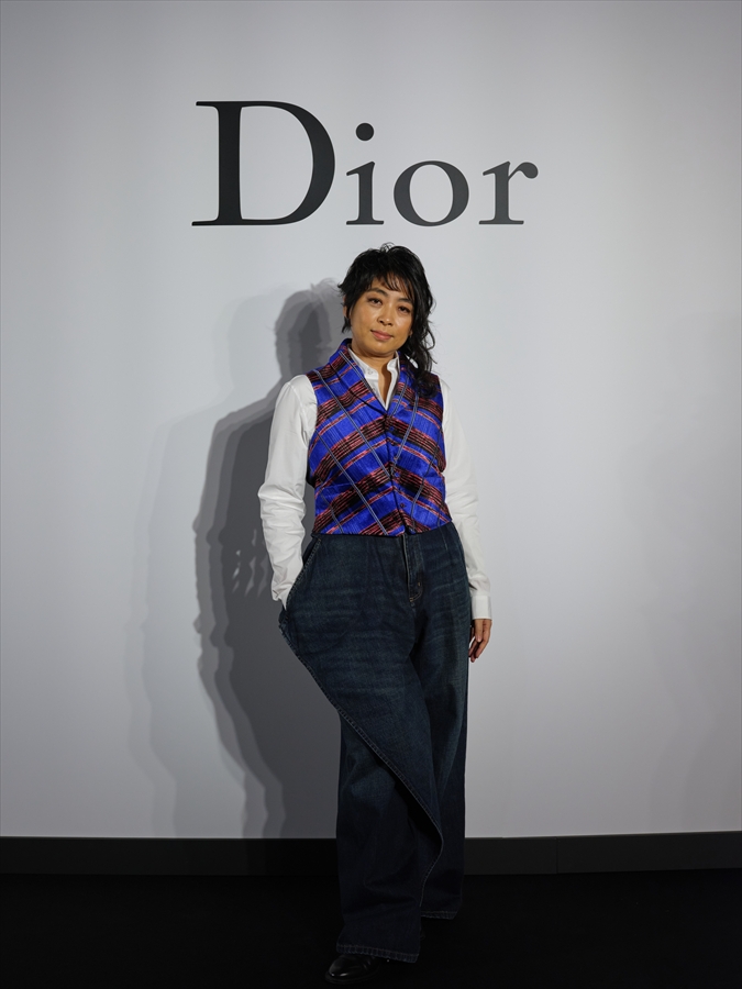 アイナ・ジ・エンドはゴージャスなグリーンのセットアップ姿で登場し、コーディネートのポイントについて「今着ているジャケットが、戦後間もない1947年にムッシュ ディオールが作ったものということで、曲線がすごく出ていて、女性らしいけど、勇敢な気持ちにもさせてくれるこのジャケットの形が大好き。今ジョナサンが再解釈して作られたみたいで、それを着させていただいてすごくうれしいです。」と語った。