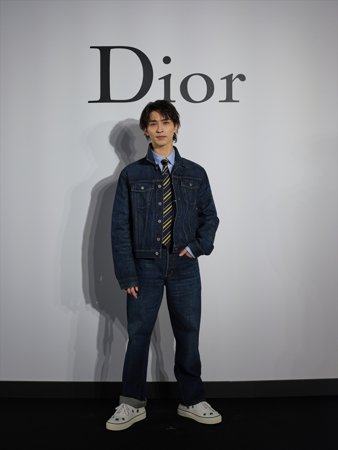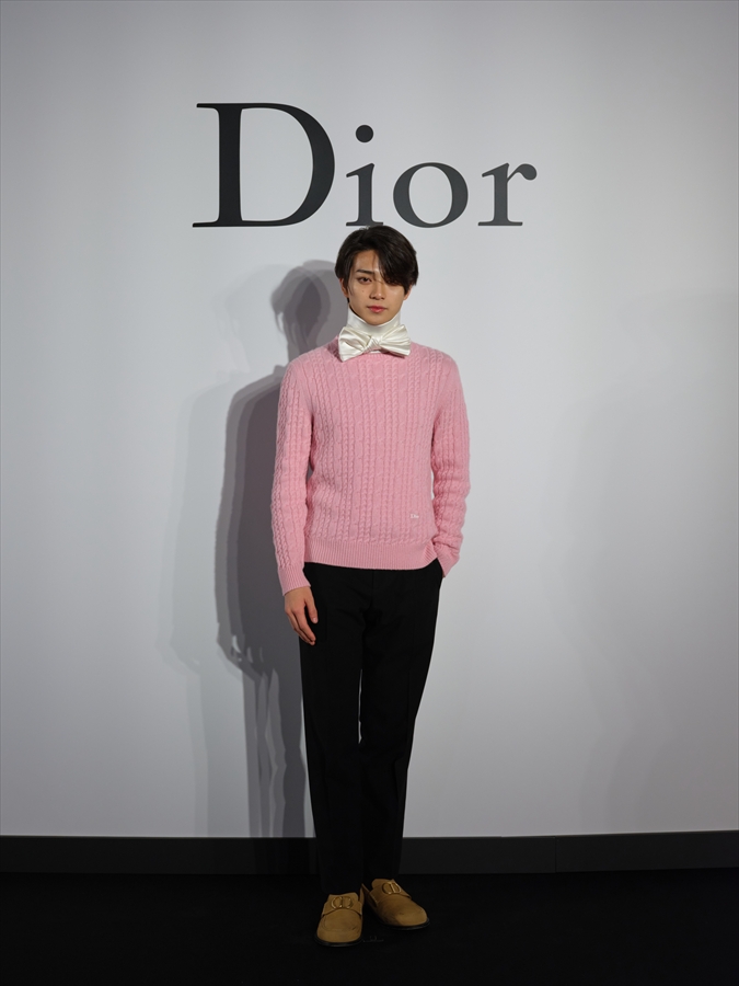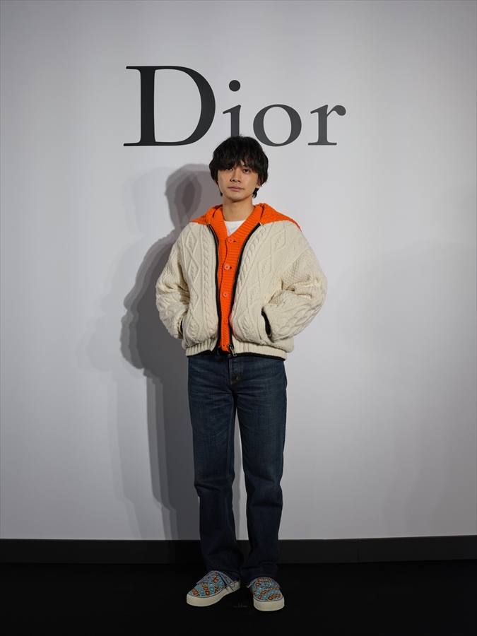 北村匠海は鮮やかなオレンジ色のニットブルゾンにデニムを合わせたカジュアルな装いで登場し、お気に入りの空間について聞かれると「日本とディオールのコラボレーションを空間として見させていただいて、今までもディオールのイベントに出させていただいた際は花の匂いを感じるイベントや京都の砂利道を歩く足音と優雅さが調和したイベントなどがありましたが、今回は視覚的に、和紙や伝統工芸などの日本のルーツをディオールに入れた空間で、見に来ている僕らとしてはなぜか居心地のいい、不思議な空間でした。」と話した。