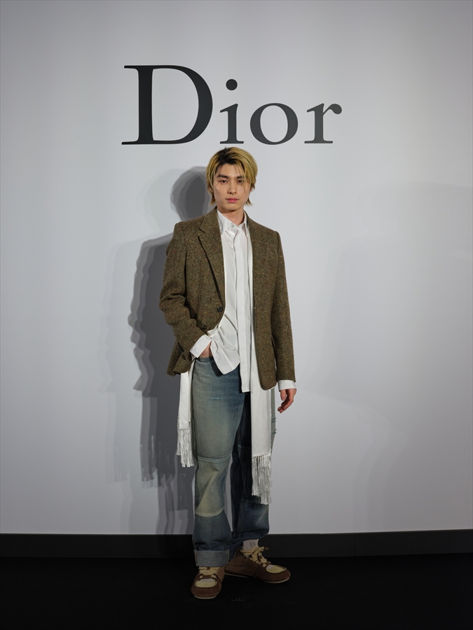 本田響矢は首元のシルクのスカーフをアクセントに、ベージュのジャケットを合わせた装いで登場し、これからの夢について「コレクションにあった装いで僕はディオールのパビリオンに来させていただいたのですが、やはり実際にパリに行って、このコレクションを見たいなと思いました。」と語った。